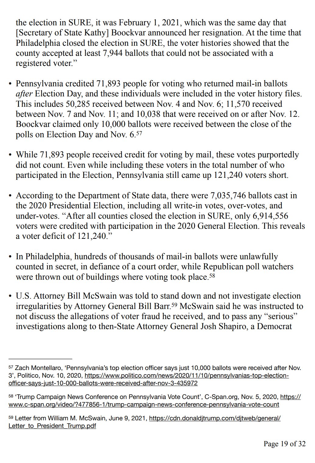 • U.S. Attorney Bill McSwain was told to stand down and not investigate election irregularities by Attorney General Bill Barr. McSwain said he was instructed to not discuss the allegations of voter fraud he received, and to pass any “serious” investigations along to then-State Attorney General Josh Shapiro, a Democrat who promised days before the election that President Trump “is going to lose.”