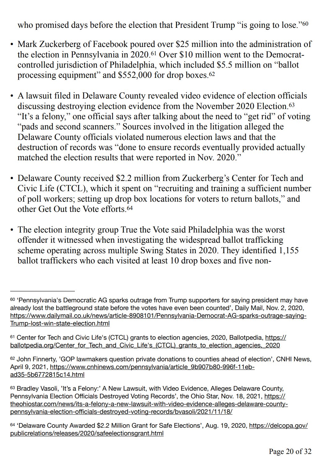 • The election integrity group True the Vote said Philadelphia was the worst offender it witnessed when investigating the widespread ballot trafficking scheme operating across multiple Swing States in 2020. They identified 1,155 ballot traffickers who each visited at least 10 drop boxes and five non-governmental organizations. Some ballot traffickers made hundreds of trips to drop boxes.