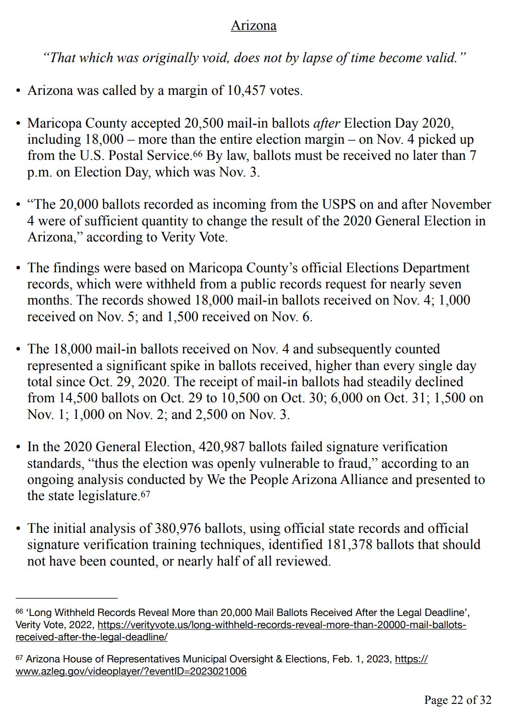 • “The 20,000 ballots recorded as incoming from the USPS on and after November 4 were of sufficient quantity to change the result of the 2020 General Election in Arizona,” according to Verity Vote.
