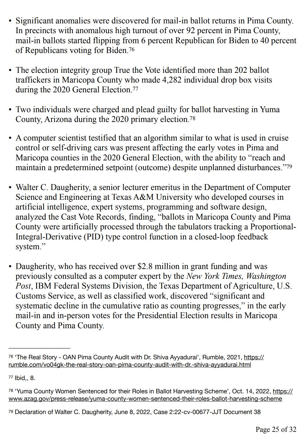 • A computer scientist testified that an algorithm similar to what is used in cruise control or self-driving cars was present affecting the early votes in Pima and Maricopa counties in the 2020 General Election, with the ability to “reach and maintain a predetermined setpoint (outcome) despite unplanned disturbances.”