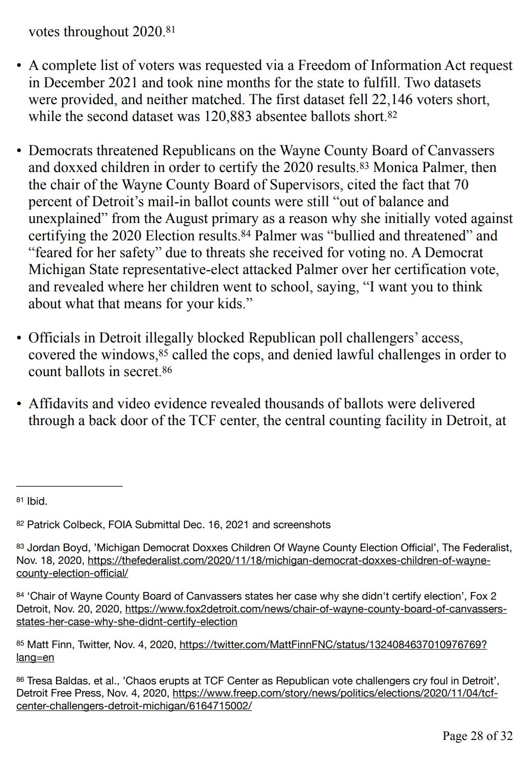 • Democrats threatened Republicans on the Wayne County Board of Canvassers and doxxed children in order to certify the 2020 results. Monica Palmer, then the chair of the Wayne County Board of Supervisors, cited the fact that 70 percent of Detroit’s mail-in ballot counts were still “out of balance and unexplained” from the August primary as a reason why she initially voted against certifying the 2020 Election results. Palmer was “bullied and threatened” and “feared for her safety” due to threats she received for voting no. A Democrat Michigan State representative-elect attacked Palmer over her certification vote, and revealed where her children went to school, saying, “I want you to think about what that means for your kids.”