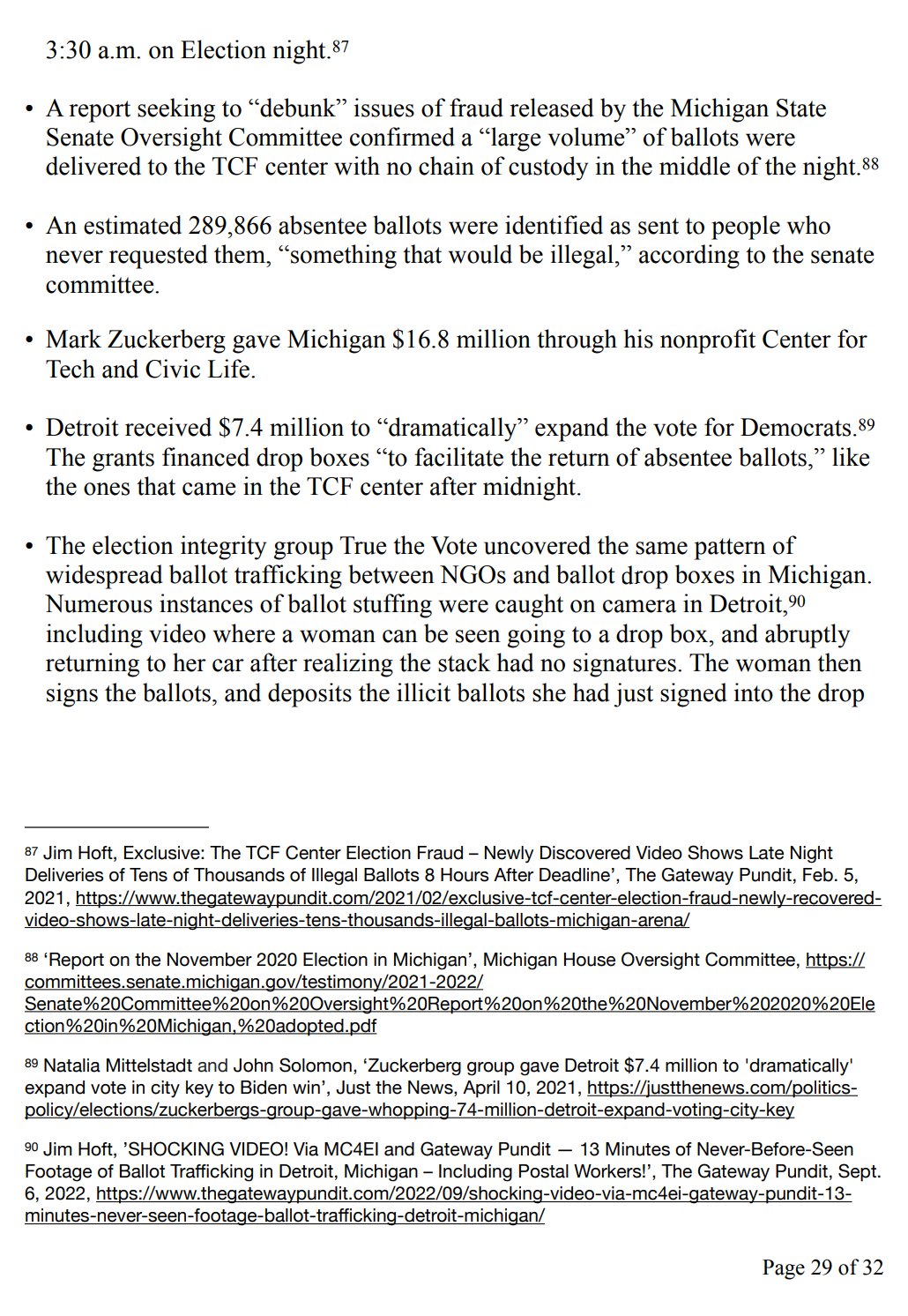 • A report seeking to “debunk” issues of fraud released by the Michigan State Senate Oversight Committee confirmed a “large volume” of ballots were delivered to the TCF center with no chain of custody in the middle of the night.