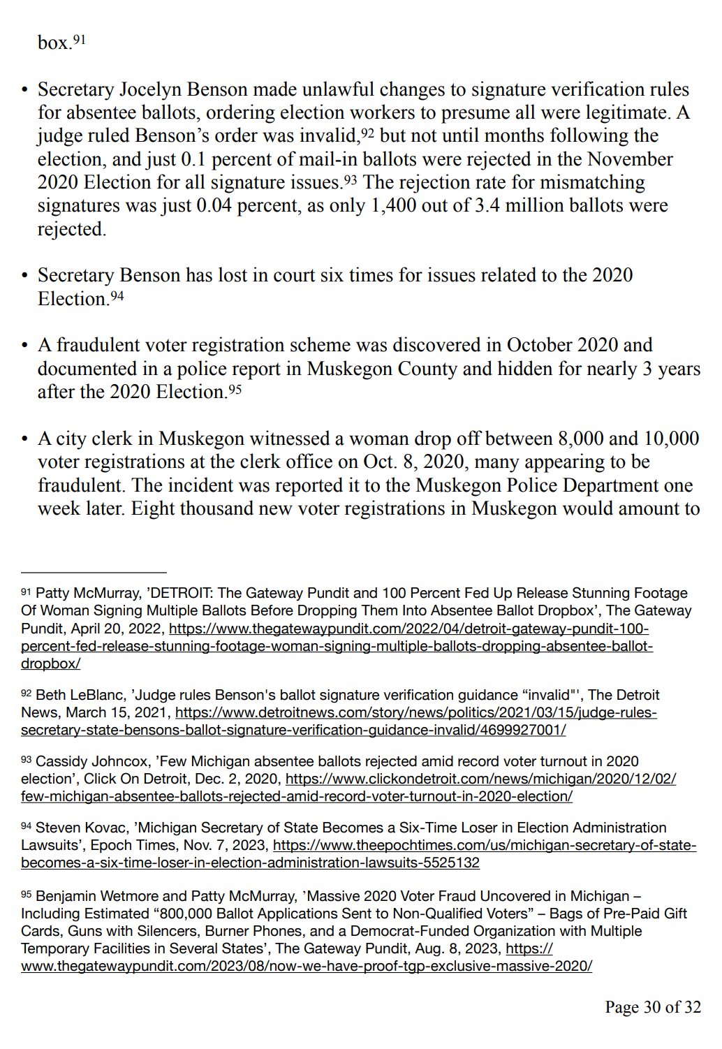• A city clerk in Muskegon witnessed a woman drop off between 8,000 and 10,000 voter registrations at the clerk office on Oct. 8, 2020, many appearing to be fraudulent. The incident was reported it to the Muskegon Police Department one week later. Eight thousand new voter registrations in Muskegon would amount to over 20 percent of the city’s population of only 38,000 residents.