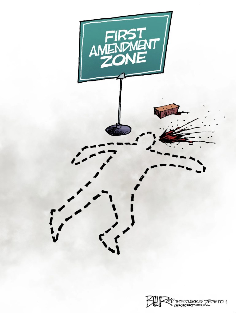 Where can those who mean to punish people who make such utterances find their prey? In the First Amendment Zone. But remember, comrades, you also have a right to self-defense. You, too, can get physical.