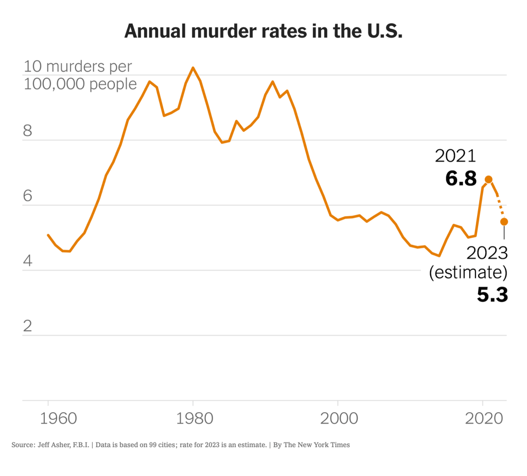 Index crimes are those crimes the FBI deems to be the most serous. There are two types: property crimes, which includes arson, burglary, motor vehicle theft, and theft-larceny; and violent crimes, includes aggravated assault, homicide, rape, and robbery. The New York Times wants you know as we approach the 2024 election that Index crime rates are falling—and not by a little: “Murder likely fell at record speed last year.” Here’s the chart they supply: