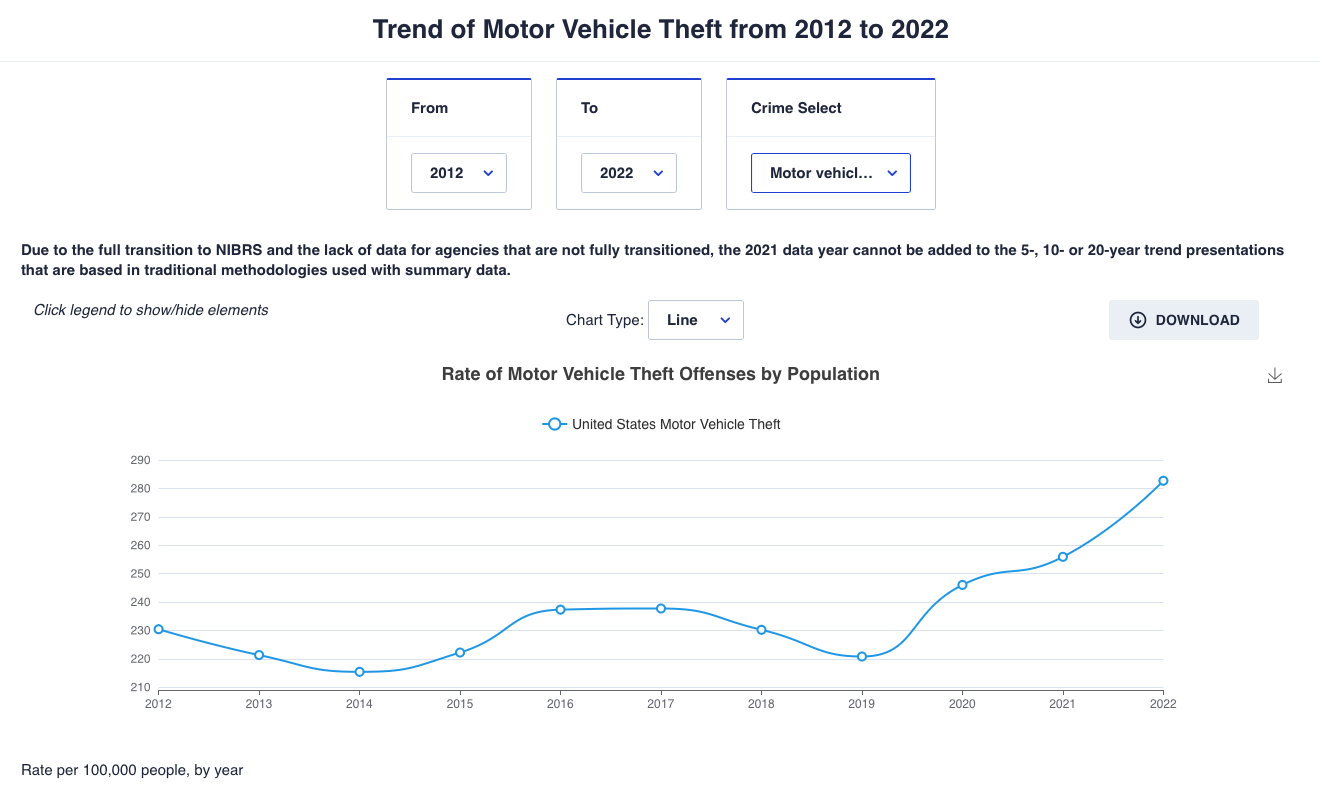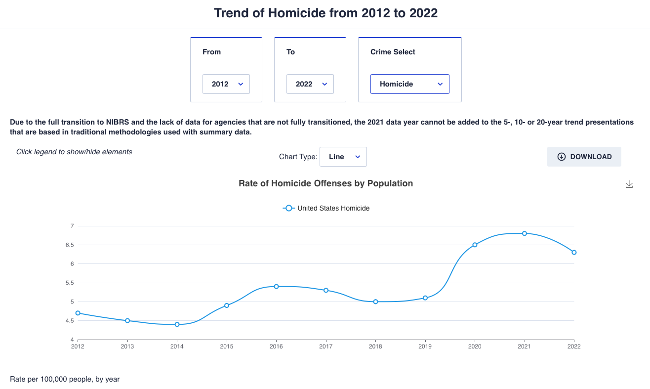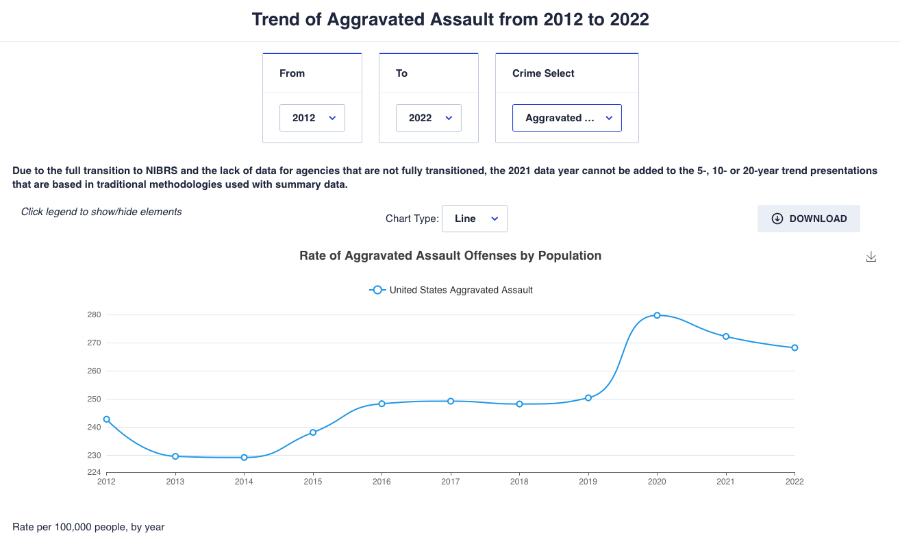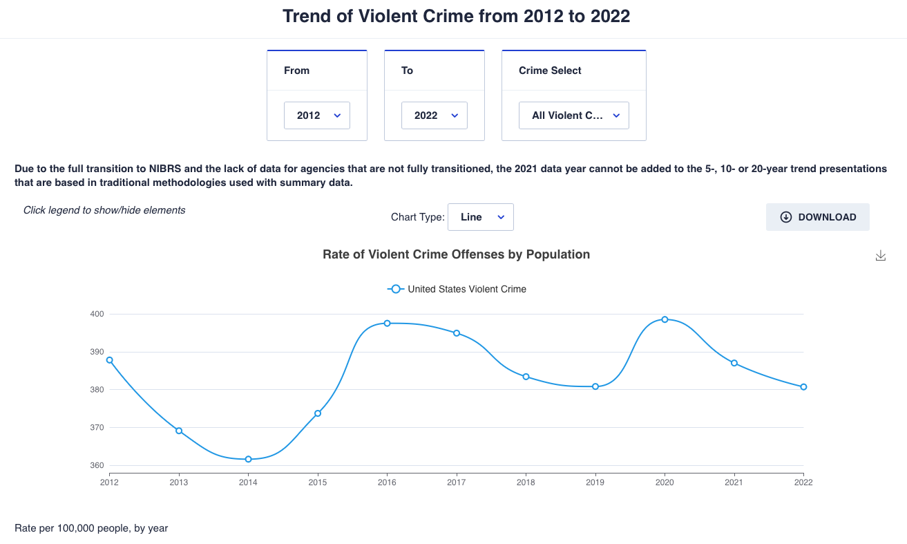 Based on FBI numbers, it does not appear that crime is drastically declining. I begin with the ten-year trend for violent crime overall as indicated by the FBI’s CDE. Again, as 2023 just ended, these data stop at 2022, which is the last substantially completed year statistically-speaking.