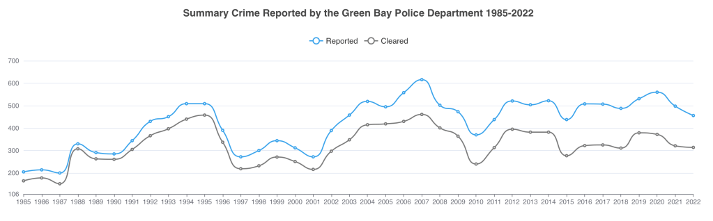 Update (January 16, 2024): The Green Bay Police Department says crime is down from last year and is lower now that at any time before the pandemic. They cite three crime types: personal, property, and crimes against society (which covers non-Index crimes such as prostitution, public drug, drug possession, etc.). All of them are down, PD claims. This isn’t true in my neighborhood, which has seen a rash of burglaries. But I am more concerned about the rate of violent crime (aggravated assault, homicide, rape, and robbery).