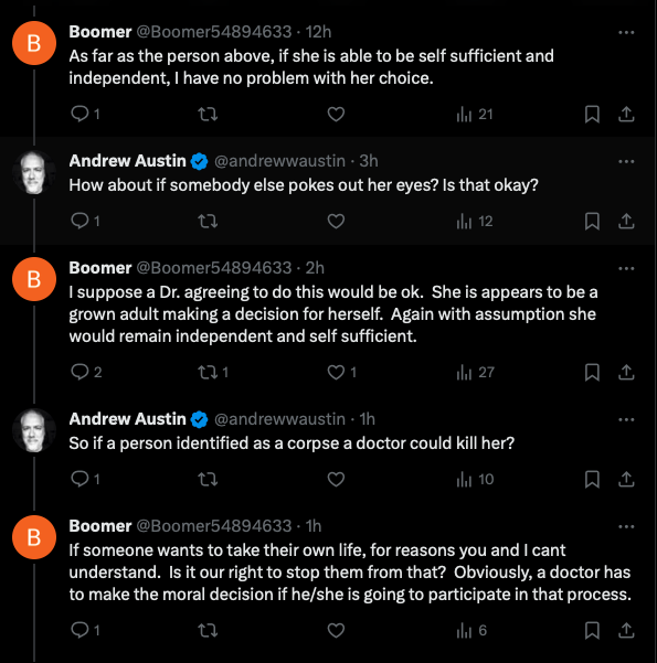 One of the arguments Boomer made during our back-and-forth is that a doctor may do a better job of poking out a woman’s eyes, which is the one thing the woman regrets. I have a friend who worked for many years at a psychiatric hospital. There was a delusional man there who tried several times to poke out his eyes. My friend was on the ward the day that the man successfully poked out his eyes. He was haunted by the fact that he couldn’t get to the man in time to stop him. Nobody at the hospital thought that the solution to the problem was to have a doctor remove the man’s eyes.