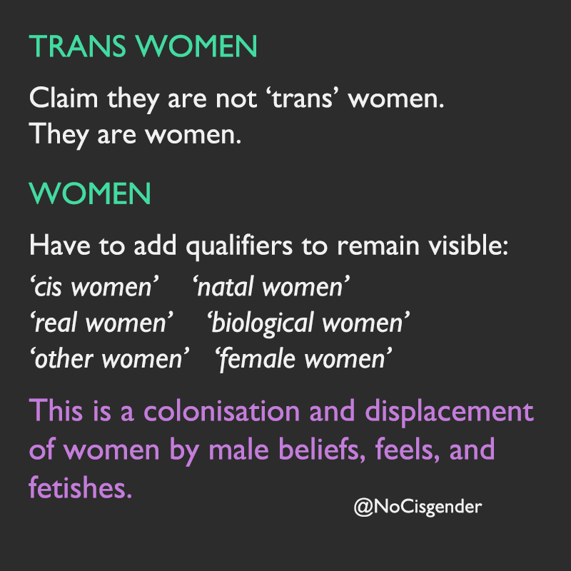 The function of such terms is to problematize gender, a strategy used by postmodernists to disrupt ordinary understanding. This goes to queer theory’s praxis of transgression. It is hoped that, by doing this, an equivalency is manufactured that puts men and women on the sample plane as men and women who want to be the other gender—or no gender at all. Really, it’s not an equivalency but a new gender hierarchy where men mimicking women are more woman than actual women.