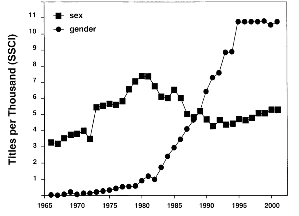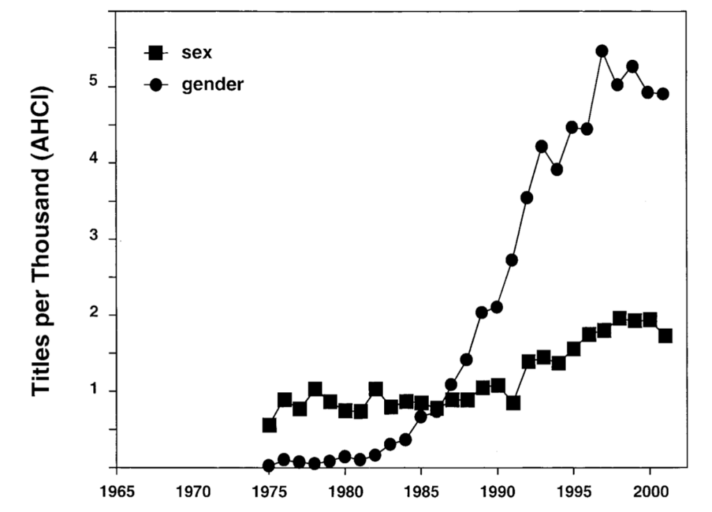 The blogger goes on cite an article by David Haig who, in a study published by Archives of Sexual Behavior in 2004, reviewed academic articles (over 30 million!) from the years 1945-2001 to determine the occurrences of the words “sex” and “gender.” Haig found that at the beginning of the period, the usages of the word “sex” were more frequent than usages of the word “gender.” This is because in the ebb and flow of synonyms, sex had become preferred. By the end of the period, however, uses of “gender” outnumbered uses of “sex,” especially in—wait for it—the arts, humanities, and social sciences.
