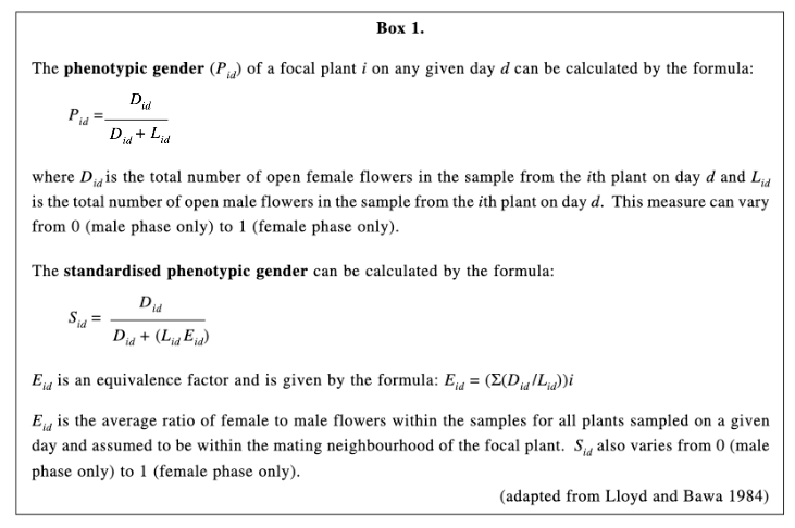 “Thus,” they continue, “plants that transmit more of their genes to progeny via their pollen than their ovules will have a male‐biased functional gender (i.e., a gender < 0.5). This bias may reflect a male‐biased phenotypic gender or sex allocation, but it may also simply be the outcome of who mates with whom, i.e., because the individual happens to be a better than average sire. Similarly, a hermaphrodite may be functionally more female than male not through an adapted sex allocation strategy but simply because its seed production is less strongly pollen‐limited. Hermaphrodite individuals that vary in their floral morphology, such as those in distylous populations, may also vary in this way in their phenotypic and/or functional gender.” Note that the authors remind the reader that when they’re talking about gender they’re using it synonymously with sex in the case of phenotypic gender.