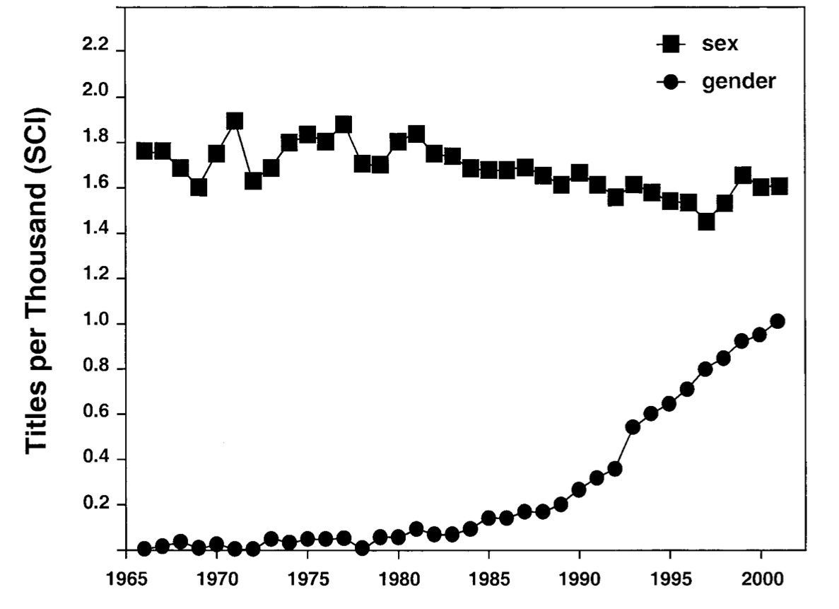 The blogger goes on cite an article by David Haig who, in a study published by Archives of Sexual Behavior in 2004, reviewed academic articles (over 30 million!) from the years 1945-2001 to determine the occurrences of the words “sex” and “gender.” Haig found that at the beginning of the period, the usages of the word “sex” were more frequent than usages of the word “gender.” This is because in the ebb and flow of synonyms, sex had become preferred. By the end of the period, however, uses of “gender” outnumbered uses of “sex,” especially in—wait for it—the arts, humanities, and social sciences.