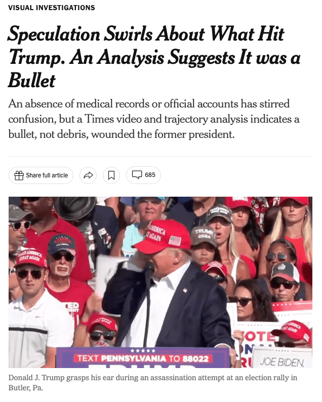 An update on the attempt to revise the history of the assassination attempt on Trump (see FBI Director Feeds Narrative Questioning True Facts About Assassination Attempt), The New York Times published an article today reporting that “a detailed analysis of bullet trajectories, footage, photos and audio by The New York Times strongly suggests Mr. Trump was grazed by the first of eight bullets fired by the gunman, Thomas Crooks. Subsequent bullets wounded two rally goers and killed a third.” That’s what I said from the beginning (see They Tried to Kill Donald Trump Yesterday).