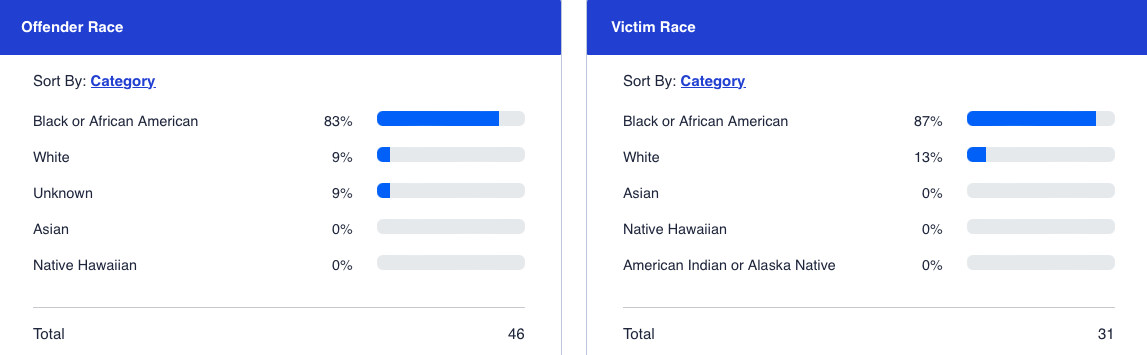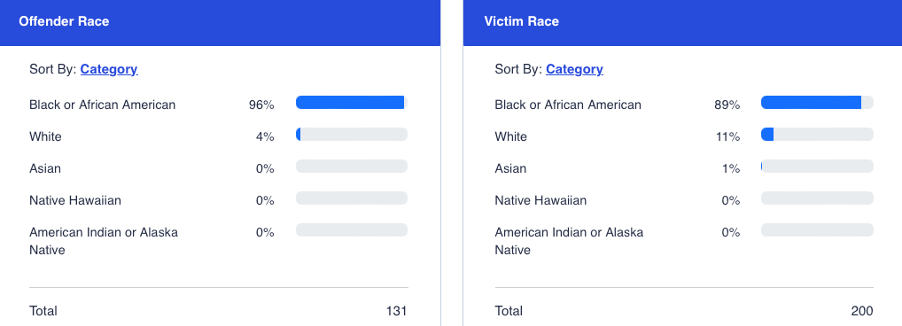 In 2022, using the St. Louis Post-Dispatch Homicide Tracker, the Greater St. Louis metropolitan area, which includes both St. Louis City and St. Louis County, reported at least 360 homicides. This figure places the area among the highest in the United States for homicide rates. The two charts form the FBI’s Crime Data Explorer presented below, St. Louis Police Department and the St. Louis County Police Department, give the reader a sense of the drastic overrepresentation of blacks in homicide. There were a total of 231 homicide victims and 177 perpetrators that year. Whites comprise 77 percent of the population in the Greater St. Louis metropolitan area, according to the 2020 census.
