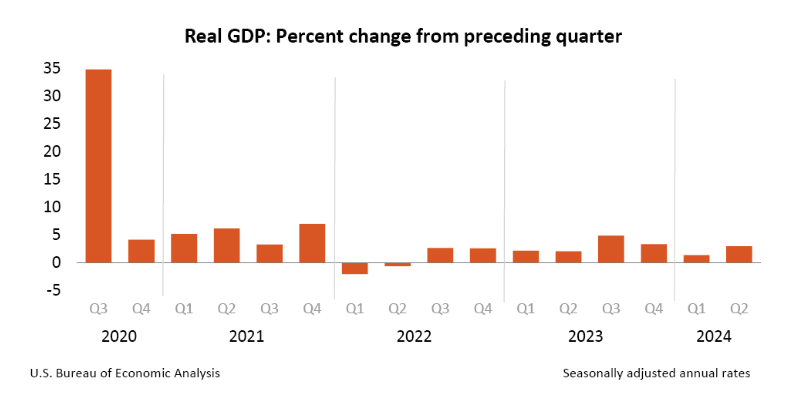 Let’s look at four metrics: real GDP, inflation, interest rates, and manufacturing jobs. Below is real GDP from the third quarter of 2020 to the second quarter of 2024. The third quarter reflect the bounce back in GDP after Trump reopened the economy in April 2020. Q4 2020 through Q4 2021 indicates the continued strength of the Trump economy. When Bidenomics take ful effect, GDP slows down considerably, even moving into negative territory before recovering, albeit nowhere near the strength it was under Trump. The reality is that Biden-Harris inherited a robust economy and throttled it.