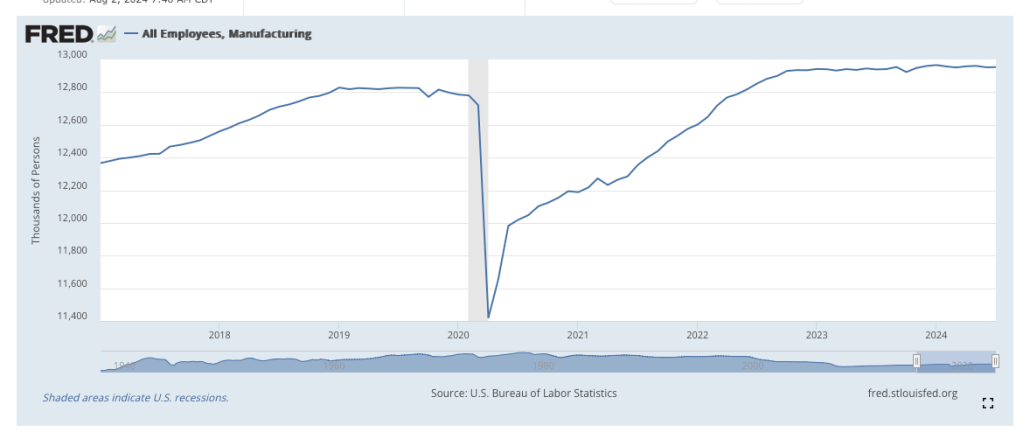 The claim that the Biden-Harris regime make about creating manufacturing jobs is largely illusory. You can see that under Trump, there was steady growth in manufacturing. The sharp loss of manufacturing jobs was a consequence of the pandemic. After Trump reopened the economy, manufacturing jobs returned. By mid-year 2022 the number returned to pre-pandemic levels. Growth in manufacturing jobs since then follow the same rate of growth established under Trump’s presidency.