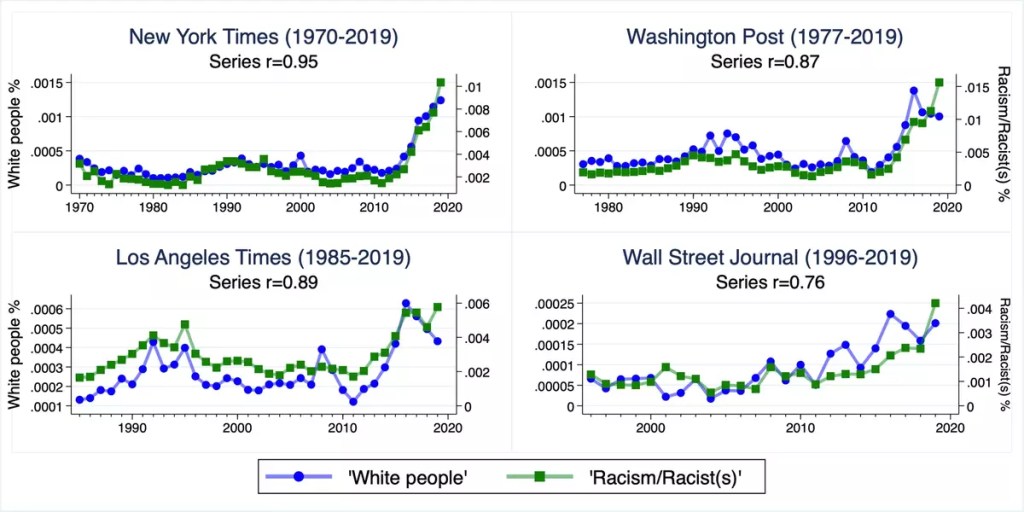 What went wrong? Around 2010, academics and the mass media began pushing the white supremacy/white privilege narrative. In a detailed content analysis of major media sources published in Tablet in 2020, “How the Media Led the Great Racial Awakening,” Zach Goldberg finds that, “[y]ears before Trump’s election the media dramatically increased coverage of racism and embraced new theories of racial consciousness that set the stage for the latest unrest.”