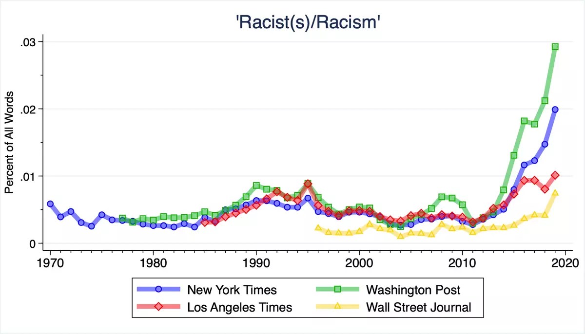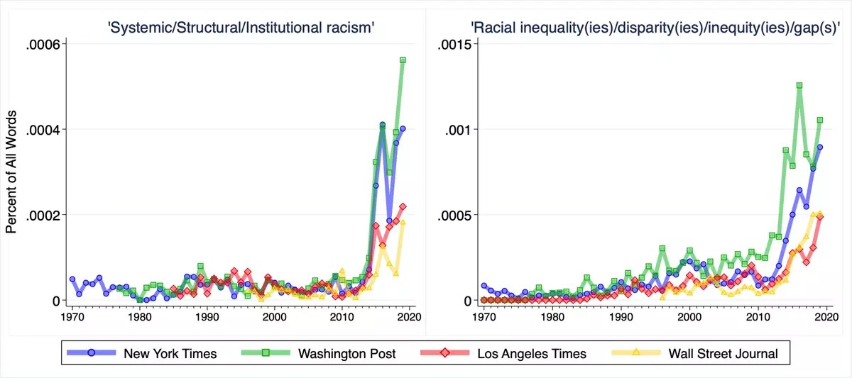 Indicated by the next several charts, the use of terms like “racists” and “racism” were buttressed by a slew of novel or academic terms developed by progressive social scientists and historians and pushed out by the corporate media and culture industry: “systemic racism,” “structural racism,” and “institutional racism”; “racial privilege” and “white privilege”; “racial hierarchies,” “whiteness,” and “white supremacy”; “racial disparities,” “racial inequalities,” and “racial inequities.”