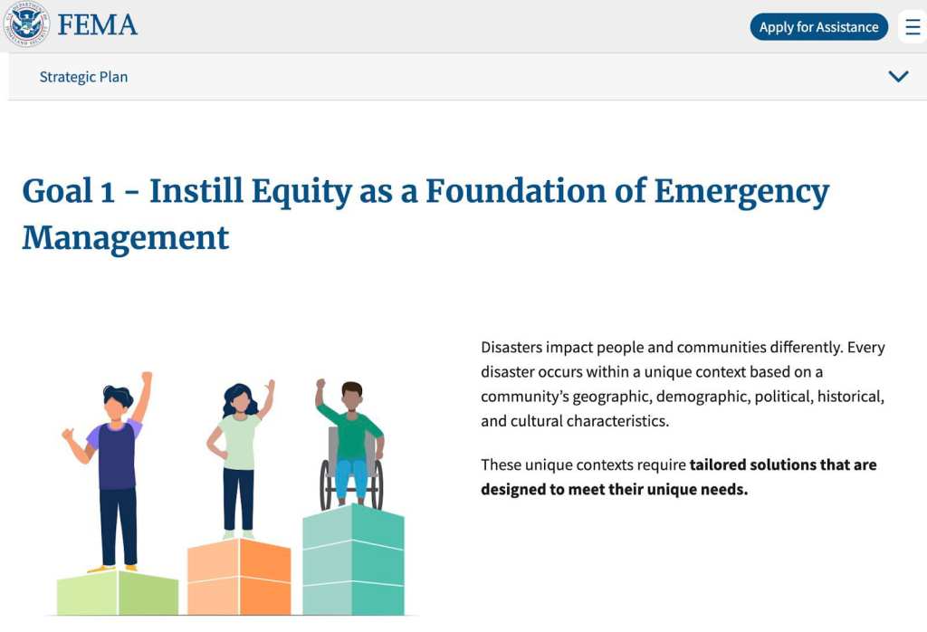 Equity only works as an equality principle in a society based on individualism when the differences between groups are intrinsic, such as in the case of women’s rights (as we have seen, progressives don’t care about women’s rights, privileging the desire of dangerous and delusional men over the needs of girls and women). That’s why the application of equity identified in FEMA’s “Goal 1” is discriminatory and unjust: because it treats individuals as concrete personifications of abstract groups and then makes decisions on that basis that differentially affect their lives.