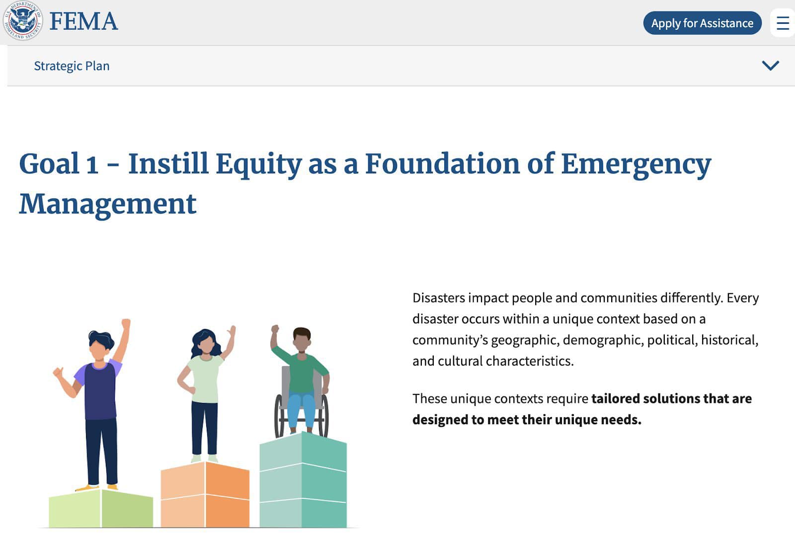 Equity only works as an equality principle in a society based on individualism when the differences between groups are intrinsic, such as in the case of women’s rights (as we have seen, progressives don’t care about women’s rights, privileging the desire of dangerous and delusional men over the needs of girls and women). That’s why the application of equity identified in FEMA’s “Goal 1” is discriminatory and unjust: because it treats individuals as concrete personifications of abstract groups and then makes decisions on that basis that differentially affect their lives.