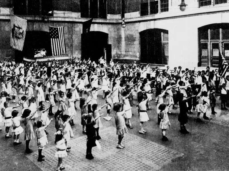 The image above is demonstration of the Bellamy salute. You can find lots of photographs of children giving the Bellamy salute on the Internet and in history books. James Upham developed the Bellamy salute in 1892 to accompany Pledge of Allegiance, written by Francis Bellamy. Bellamy was a socialist who advocated for worker rights and the equal distribution of economic resources, which he insisted were ideas intrinsic to the teachings of Jesus. The Bellamy salute was the way to address the US flag until 1942. The flag code was changed to avoid identification with the Nazis. Our monuments still retain the fasces, however (see the adornments in the House of Representatives or the Lincoln Memorial).