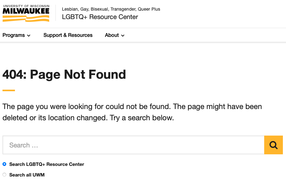 The NIH adapted its pronoun list from the “Gender Pronouns Guide from UW Milwaukee LGBTQ+ Resource Center.” I clicked on that link and it, too, is 404. As with the NIH document, I grabbed a screen shot from this page, as well, which you can also find in the essay cited above.
