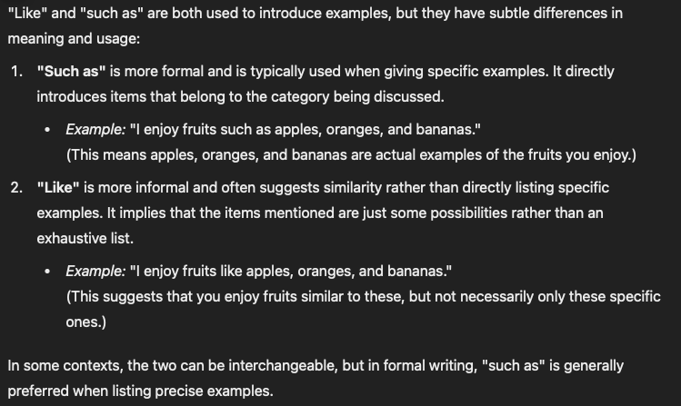 Here’s another thing. It’s common in conversation to use “like” when the speaker should say “such as.” I just asked ChatGPT to explain the difference between these words. Here’s a screenshot: