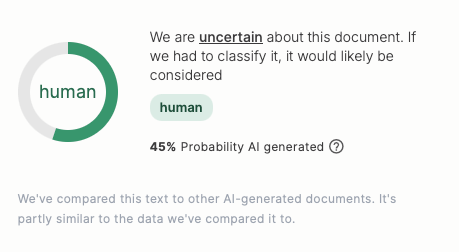 This is the fundamental flaw of AI detection tools: they don’t actually understand writing or originality. They just analyze statistical patterns and compare them to known AI-generated outputs, which are instantiations of well-written content, using standards all good writers should strive to develop in their writing. As a result, good writers may be punished for being good writers.