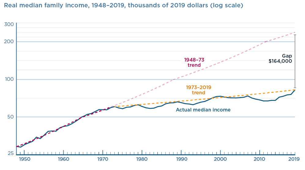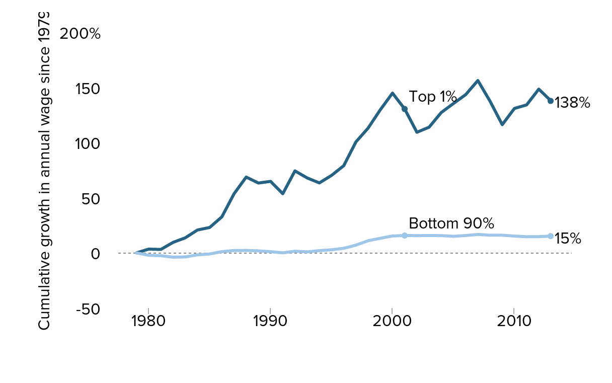 After a bump in the late 1990s, after a long period of decline, annual wages for 90 percent of the American population have been flat since 2000—while the income for the top one percent soared. This is the effect of offshoring high-wage value-added manufacturing, mass immigration, and rationalization of industry.