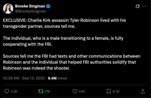 Trans rage is a major component of this movement. What happened to Charlie Kirk is the same rage that motivated the March 2023 mass shooting at Covenant School, a private Christian elementary school in Nashville, where Audrey Aiden Hale carried out the killing of three children and three adults. It is the same rage that, only a few weeks ago, drove Robert Westman, who also identified as transgender, to open fire during Mass at Annunciation Catholic School and Church in Minneapolis, killing two children and injuring several others.