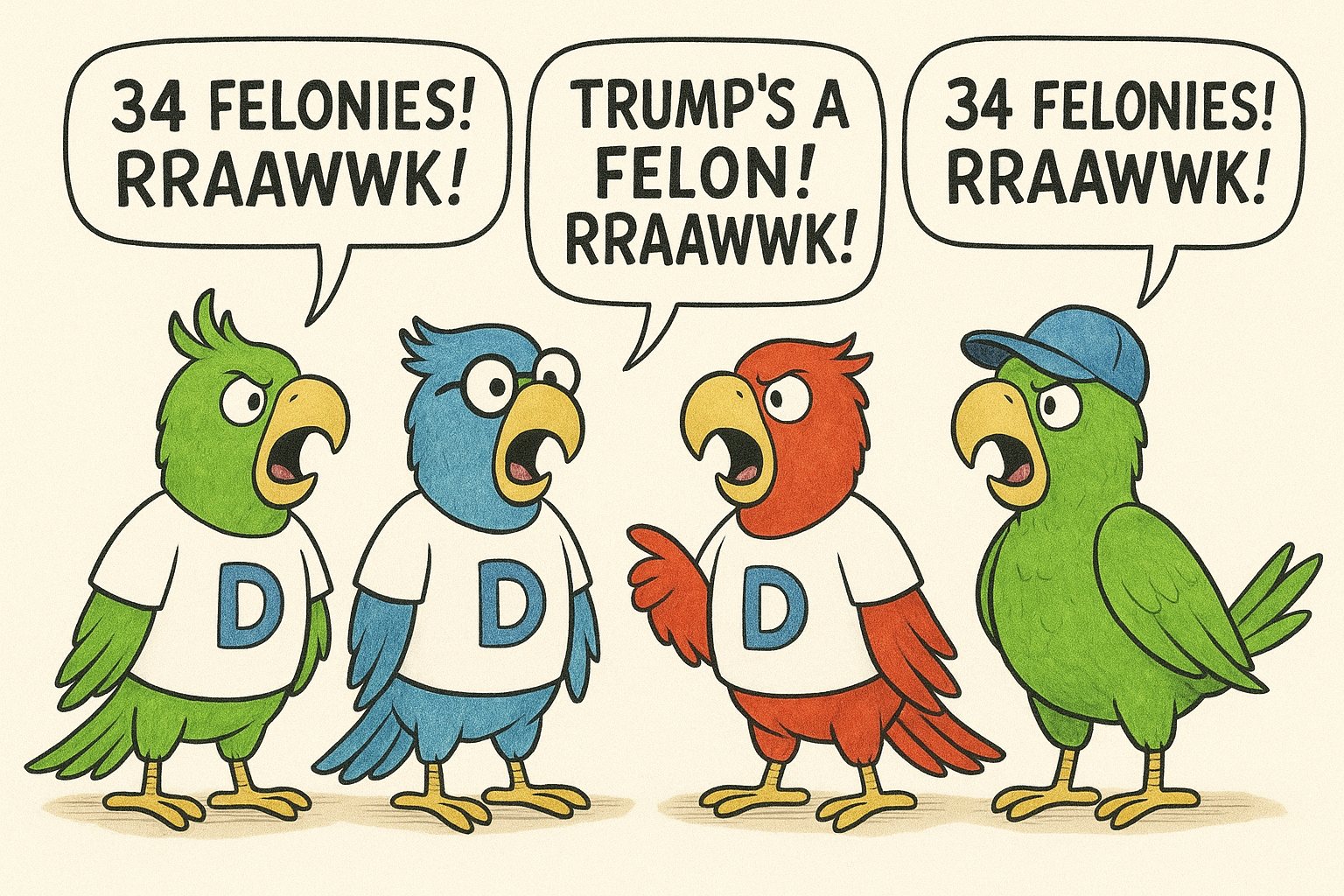 Trump’s New York “hush-money” case is a farce, a textbook show trial. The purpose of the case was not justice. It was so party parrots could clack around squawking “34 felonies! Rraaawk!, 34 felonies!” “Trump’s a felon! Rraaawk!” They’re still squawking.