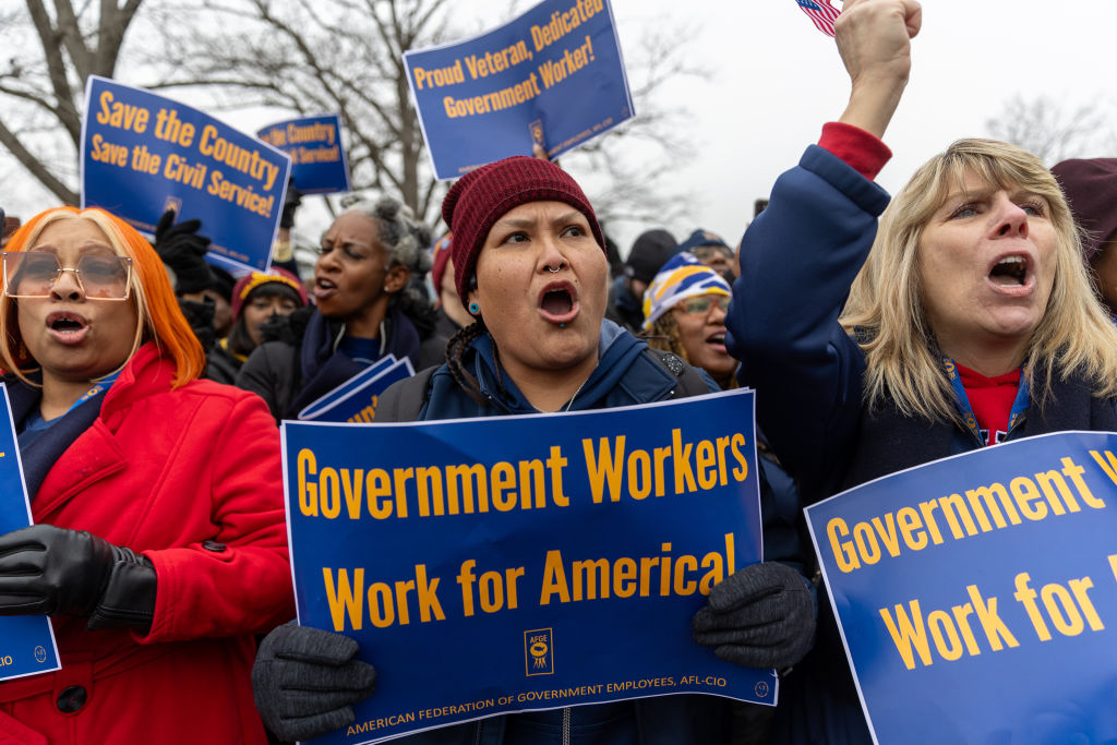 Members of the American Federation of Government Employees (AFGE) union protest against firings during a rally to defend federal workers in Washington, DC, February 11, 2025. Source of image: Jacobin