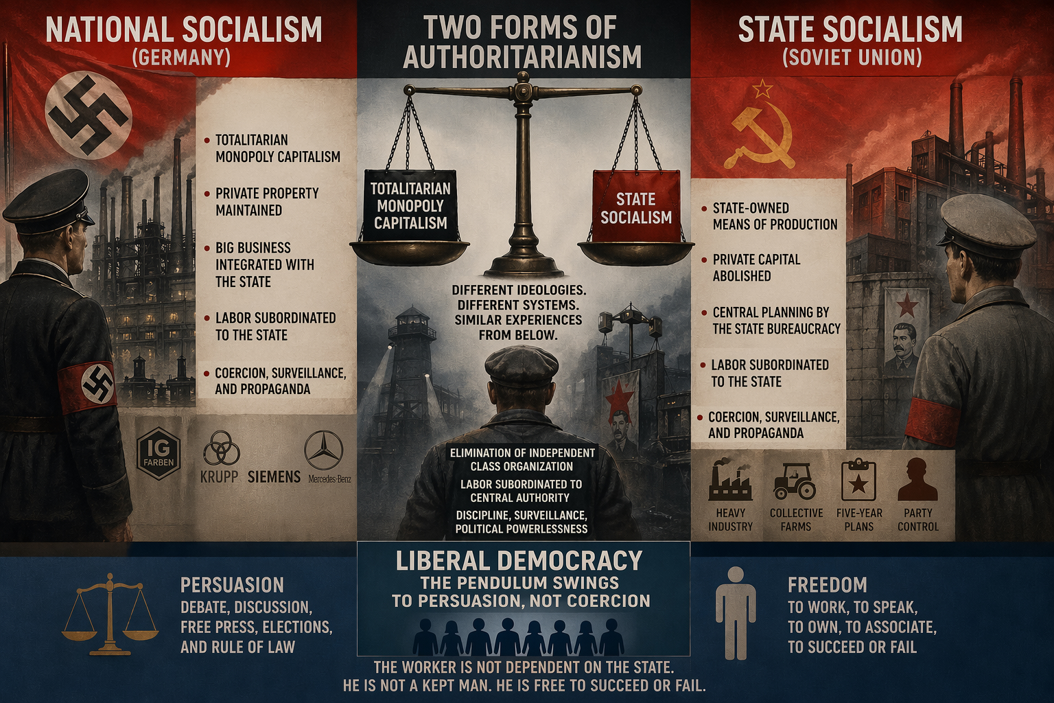 The persistent confusion—especially among conservatives—that National Socialism was socialist stems less from its name or a theory describing its character than from intuition. At the level of lived experience, workers in Nazi Germany and in the Soviet Union both confronted systems that eliminated independent class organization, subordinated labor to centralized authority, and sharply constrained autonomy.
