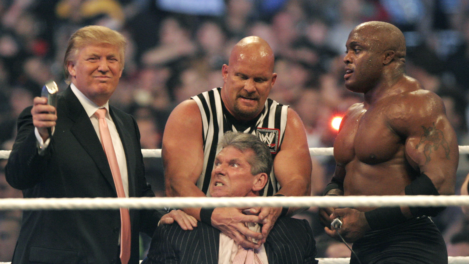 WWE chairman Vince McMahon prepares to have head shaved by Trump and Bobby Lashley while being held down by ”Stone Cold” Steve Austin after losing a bet in the Battle of the Billionaires at the 2007 Wrestlemania.