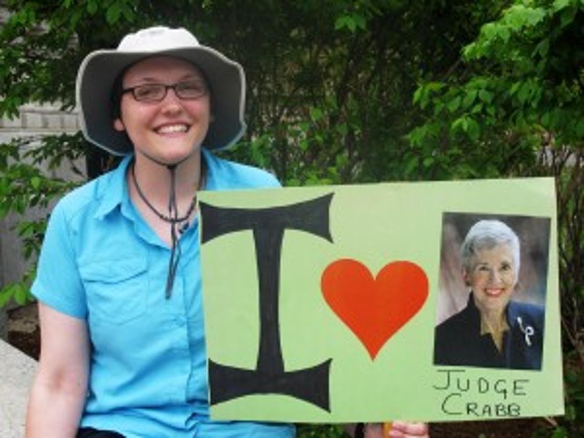Former student Bonnie Gutsch, now of the Freedom of Religion Foundation, showing her appreciation for Judge Crabb’s defense of our secular republic (Associated Press picture published by Madison.com)
