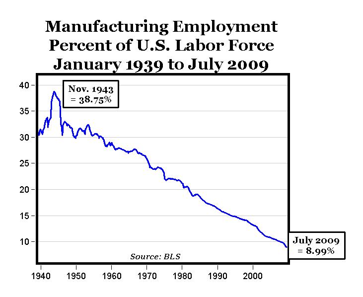 Some talk of “de-industrialization” and claim that the late capitalist stage is the “post-industrial” stage, but as Mandel points out, it’s not that industry has disappeared, just that it has moved to different parts of the world, and automation, mechanization, and scientific management are replacing and displacing human labor. This trends continues. Manufacturing jobs have been disappearing in the United States as output in this sector has been holding steady since at least 1947. According to the Bureau of Labor Statistics, less than 10 percent of the workforce is now employed by manufacturing.